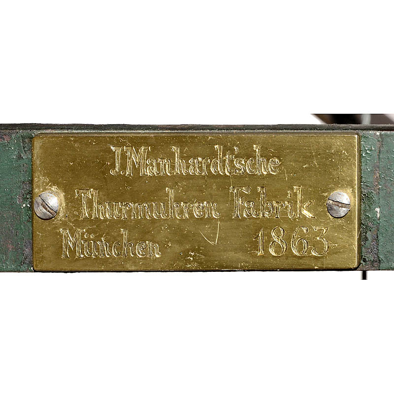 Manufactured by: "J. Manhardt'sche Thurmuhren Fabrik, München", iron frame, brass wheels, 3 trains, enameled subsidiary dial, size 42 x 47 x 103 in., complete with hands, pendulum and weights, working.