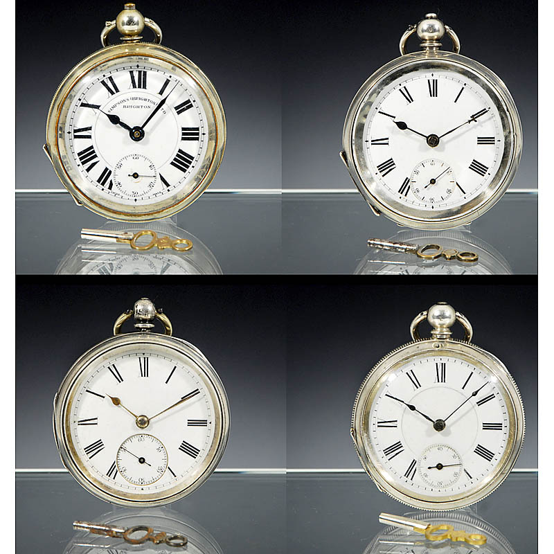 1) "The Portland of Bristol", Birmingham 1884, Sterling silver, needs cleaning. 2) "Simpsons Ltd., Brighton", Swiss made, c. 1900, nickel, working. 3) "101043N" stamped on the movement, Birmingham 1888, Sterling silver, with dust cover, working. 4) "The Papagon Trade Mark, Swiss", c. 1900, silver (925), anchor escapement, needs cleaning.