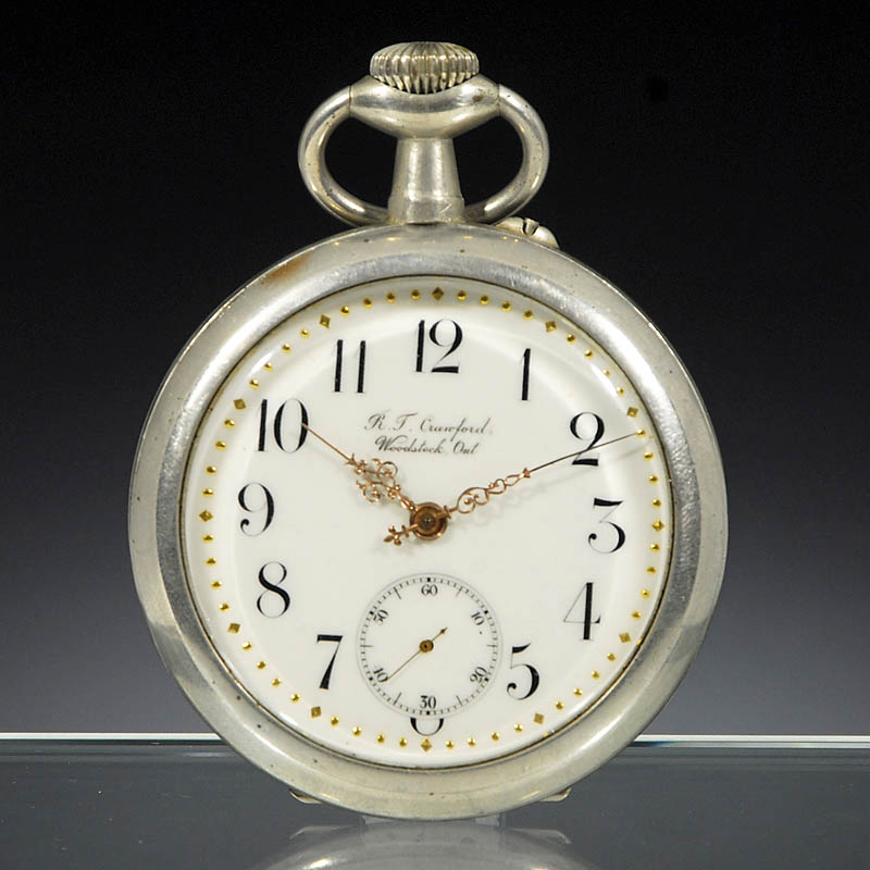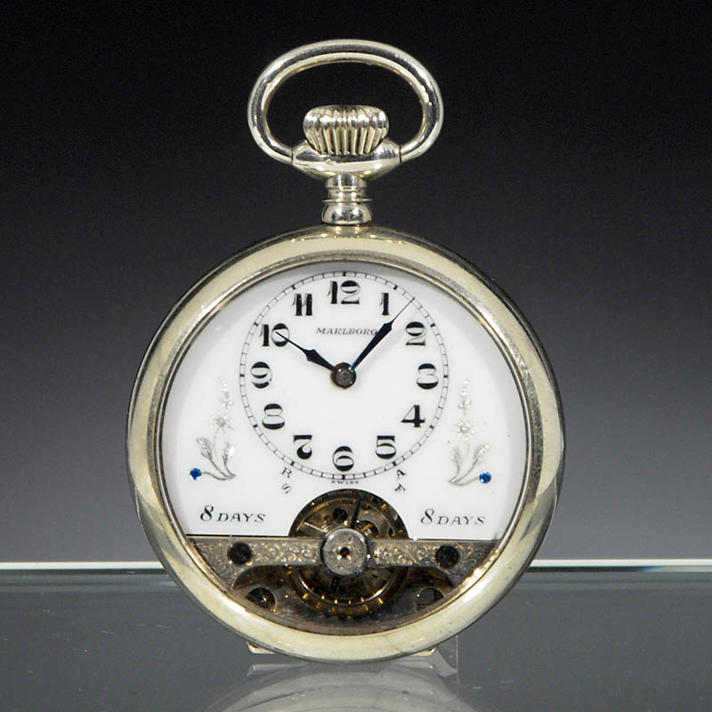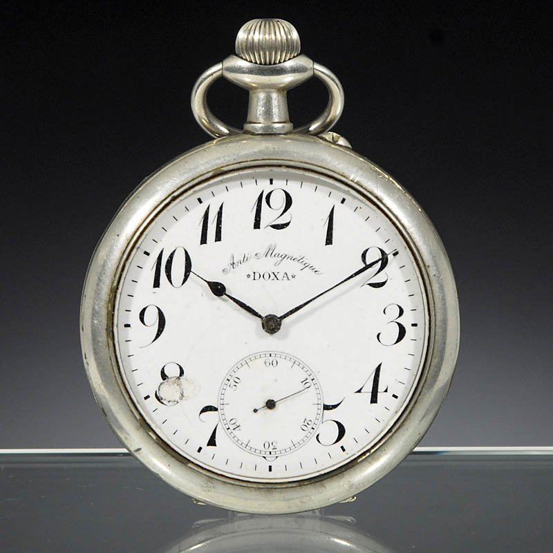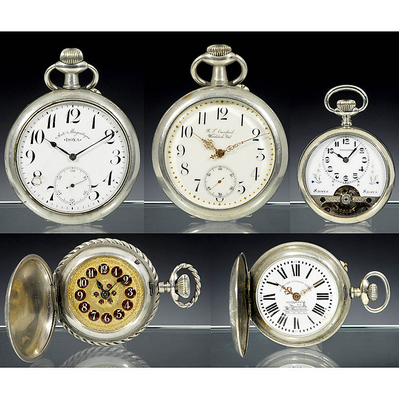 1) "Doxa", lever escapement, c. 1920. 2) "La Protexion", Roskopf patent, lever escapement. 3) "Crawford", lever escapement, c. 1910. 4) "Marboro", 8-day movement, Switzerland, c. 1910. 5) "Remontoir", trainman watch, spring-cover, Roskopf patent. 2 dials with minor damage. – All clocks are running.