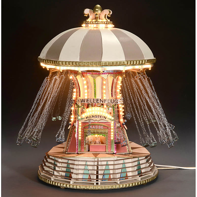 Large fairground model, with 32 seats and ticket box, wood and metal, hand-painted, electric light and motor, Ø 18 ½ in., height: 25 3/5 in. – An impressive working model!