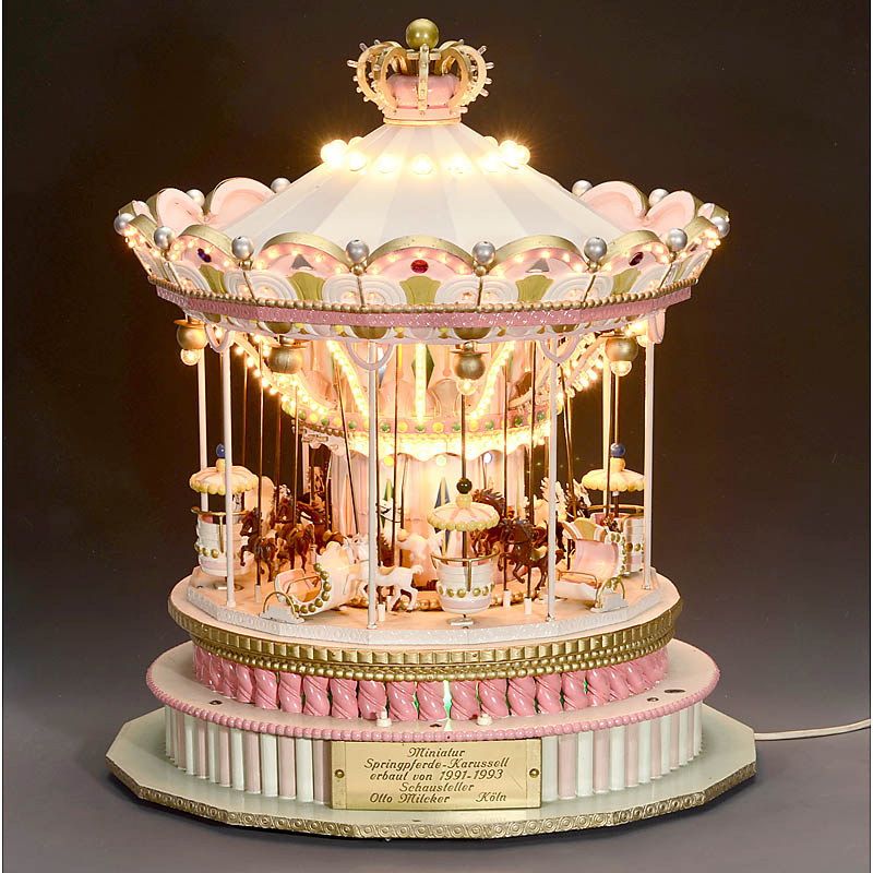 Fairground model; with horses, swinging coaches and gondolas; wood and metal, hand-painted, made by: "Otto Milcker, Köln", electric light and motor drive, with music (tape recorder), Ø 24 in., height: 28 1/3 in.