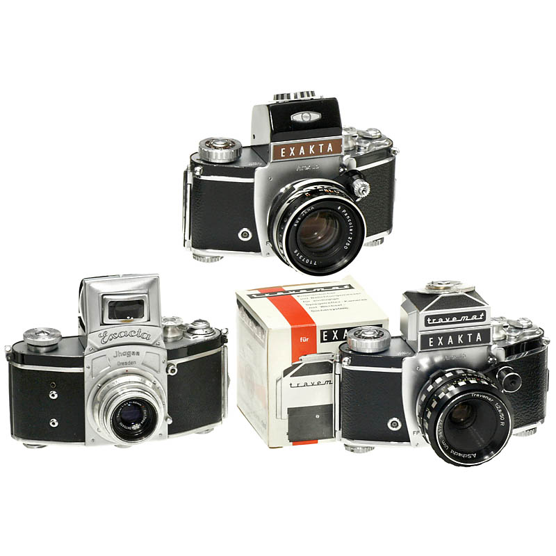 2) Exakta Varex IIb, no. 1044420, 1963年, Travenar 2,8/50镜头, 罕见的Travemat五棱镜取景器,TTL-metering用, 附带说明书和纸箱. (2/3)