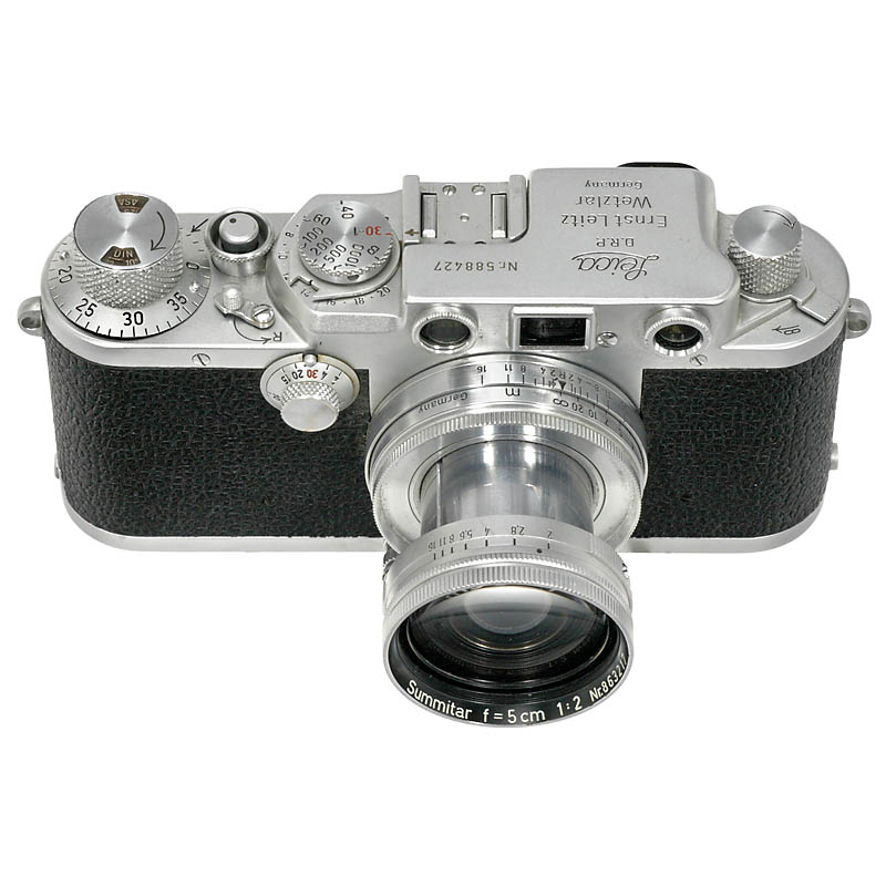 Leitz, Wetzlar. No. 588427, 黑色同步刻度, 测距仪模糊. 附带 Summitar 2/5 cm镜头, no. 863217, 米刻度.