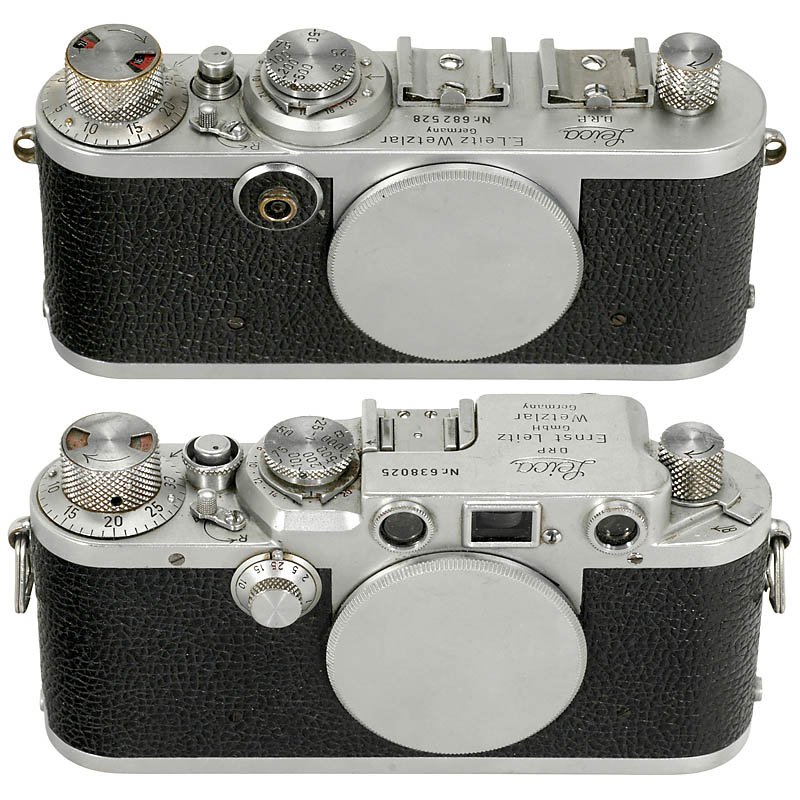1) Leica If, no. 682528, 1955年. 快门粘涩, 一些小凹痕, 无论如何是一部罕见的收藏品. (3-/3–4)