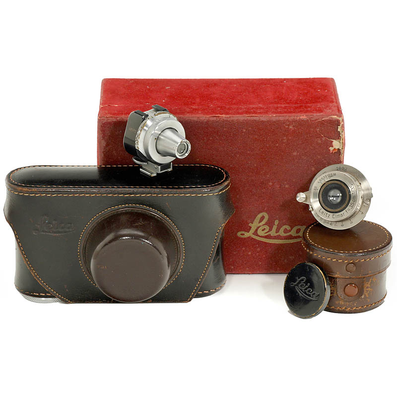 1) Elmar 3,5/3,5 cm, 镍, 无穷远锁定在7点钟, no. 215931, 1934年, 英尺刻度, 计数器表盘带0刻度, 有原装的镜头盖和箱子. (3/3)