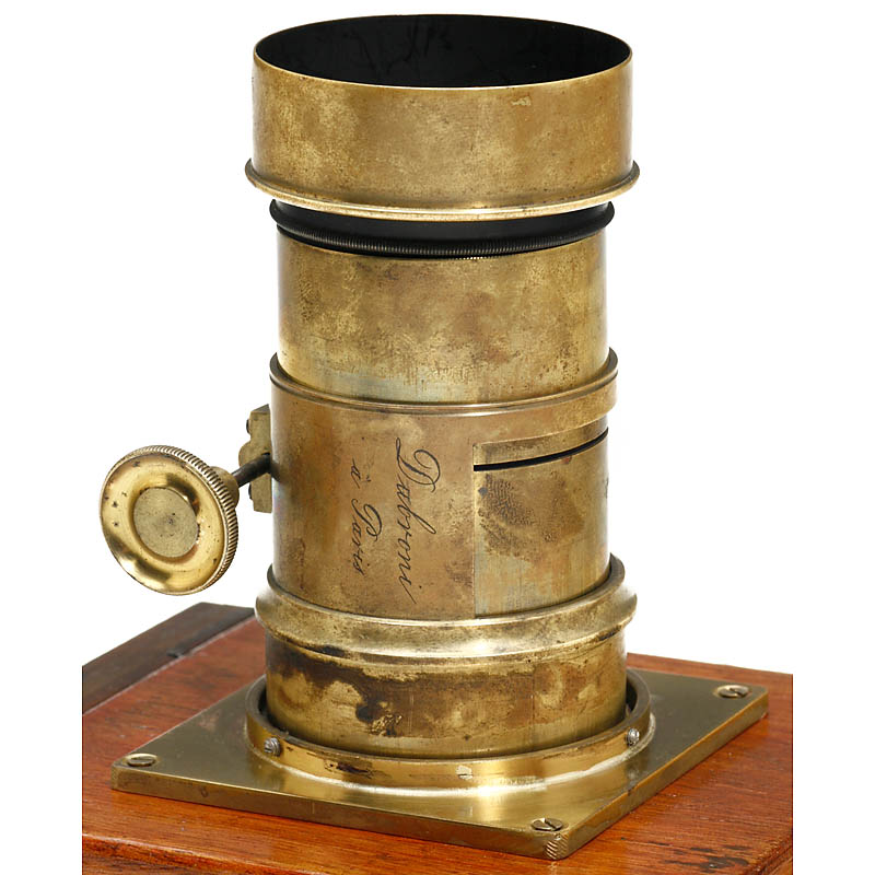 Dubroni, Paris. 原装黄铜镜头, Dubroni No. 2专用, 齿条齿轮传动装置, 插入式光圈用. 镜头高度: 4 英寸, Ø 2 1/3 英寸. 带一台Dubroni相机复制品.