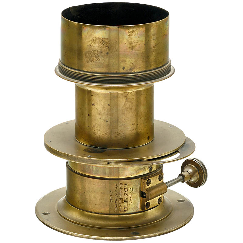 Alexis Millet, Opticien Bte S.G.D.G., 160 r. St. Martin, Paris. No. 2005. 非常奇特的设计, 黄铜镜头, 大约40 cm 焦距, 旋转光圈, 带黄铜遮光罩和接环. 连遮光罩的镜头高度是20 cm, Ø 10 cm, 齿条齿轮传动装置不工作.