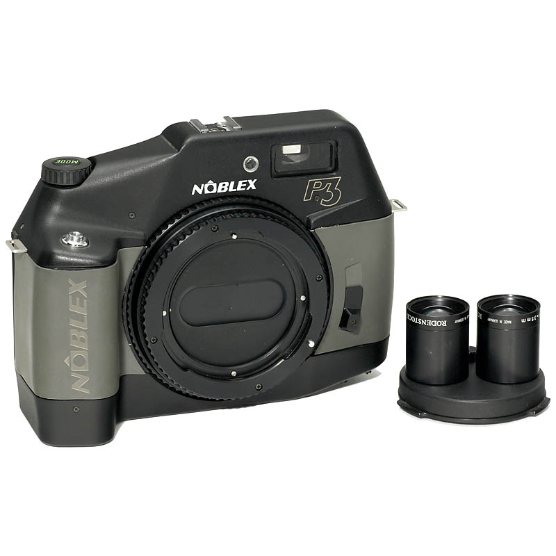 Kamerawerke Noble, Dresden. "Photokina 1996", 胶片型号 135 (24 x 35 mm), 不工作, 35 mm 万能照相机系统(24 x 35 mm) – 全景 (24 x 70 mm) – 立体 (24 x 34 3D), 可替换镜头: 2支 Rodenstock Noblar W 5,6/35 mm镜头, 可替换后背. – 这款相机只生产过3件! – 附带3张 "Noblex P3"广告单.