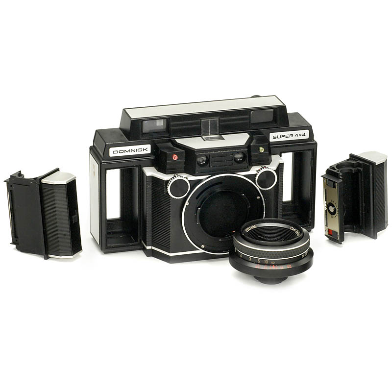 Domnick, Wiesbaden. 以"Panamericana" 系列的创造者而闻名的Hans Domnick, 开发了两种不同的"双暗盒相机" (例如彩色和黑白同时使用), Super 4 x 4 (film 127) 和 Profi 6 x 6 (film 120). 他获得蔡司依康福伦达, 西门子, Bertram, 和卡尔蔡司公司的资助. 这件拍品是一件不能工作的样品, 装有一个特别的卡尔蔡司 Sonnar 2,8/60 T* 镜头.