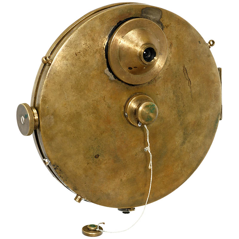 无标记, 据推测生产商是"Le Docte Constructeur Chimiste, Bruxelles". Small version of detective camera "System Stirn", 相机直径14 cm, 6张照片 Ø 35 mm, 黄铜机身, 内部部件更换过, 弯月形透镜, 快门工作!