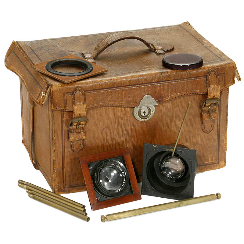 Kershaw & Sons Ltd., London. 贵重木料做的机身带黄铜和紫铜覆层, 规格 3 ¼ x 4 ¼ in., 黄铜镜头 Cooke Anastigmat 5.6/240 mm, 酒红色皮制皮腔和取景器, 帘幕式快门工作. 带相机套, Tessar 4,5/18 cm 镜头和 Tessar 4,5/15 cm 镜头.