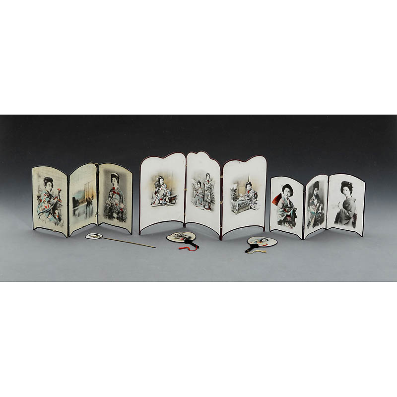 印在纱布上. 3个屏风, 2把印有装饰画的扇子和1个扣帽饰针. 罕见!