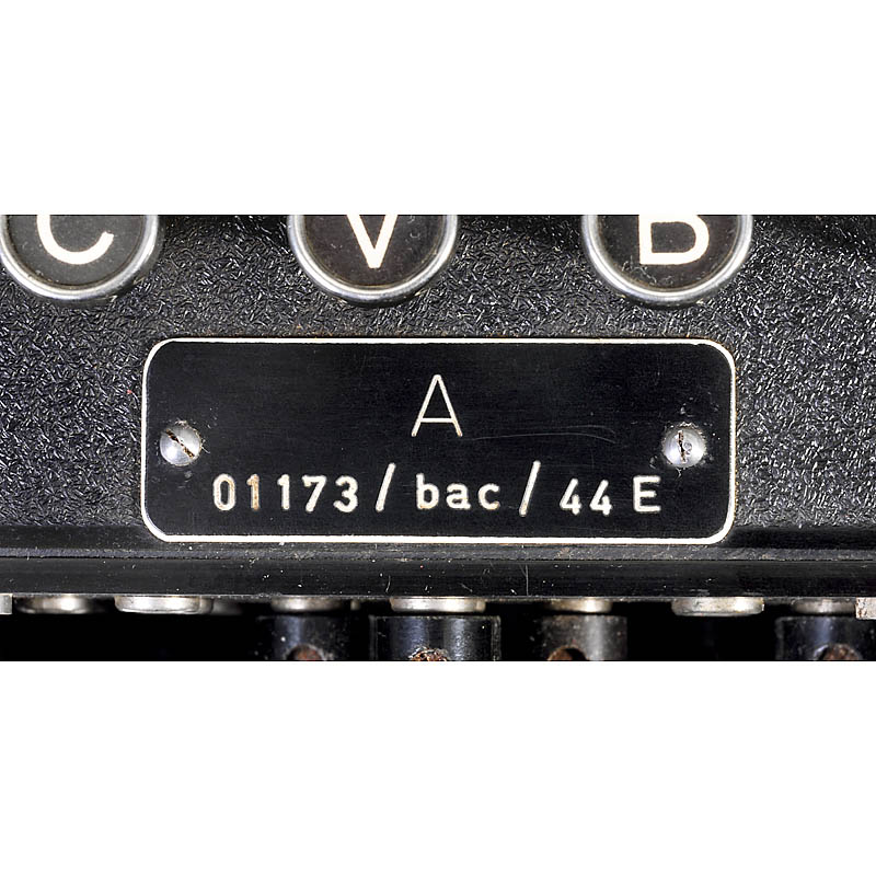 传奇而神秘的德国密码机, 它对二战的进程起到决定性影响, 对战争的最终结束也做出了非常大的贡献. 战争初期"隐谜"为德国的一马当先奠定基础, 直到英国人在德国指挥官的疏忽之下, 成功截获一艘损坏的潜水艇, 获得一台"隐谜". 同时, 密码和完整的编码系统也落入他们手中. 为掩人耳目, 英国军官把Alfred Knox和Alan M. Turing两位数学家奉为"超级大脑", 他们想要创造出第一台能够自由编码的电子计算器来破解"隐谜". 当然, 这都只是传说! 因为柏林的亚瑟·谢尔比乌斯发明的这种密码机完全不重复就可以产生 220亿种(!!)密钥组合. 形象的说呢, 假如一个人每分钟能使用一个新的密钥组合,他夜以继日不停地工作,也要42000年才能将所有的密钥组合全部用完!这种功能杰出的密码机有三个转子, 当按下键盘上的一个字母键,相应加密后的字母在显示器上通过灯泡闪亮来显示,而转子就自动地转动一个字母的位置。这就是“恩尼格玛”难以被破译的关键所在,这不是一种简单替换密码。同一个字母在明文的不同位置时,可以被不同的字母替换,而密文中不同位置的同一个字母,又可以代表明文中的不同字母,字母频率分析法在这里丝毫无用武之地了。制造商是: 德国慕尼黑的Ertel. 序列号为no. 44 E(rtel). 带3个原装转子, 序列号分别为A-01173/44E (I), A-01173/44E (II)和A-01173/44E (IV). 灯泡更换过. 这是史上最伟大的科技收藏品和展览品之一!
