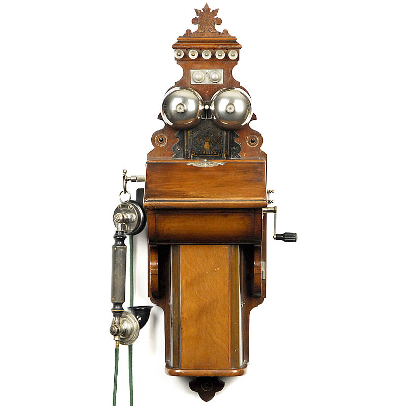 "Emil Møller, Horsens", 木盒, 3个磁体感应器, 原装电话听筒, 高度为75 cm.
