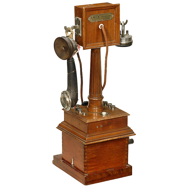 "Wich-Deckert"装置, 听筒上有标记: "C. Wich, Paris", 第二个接听设备制造商为"S.F.T.", 柏林的装置, 胡桃盒, 带曲柄感应器的底座制造商为"Thomson-Houston, Paris", 全部高度为51 cm. 一件非常罕见的收藏品!