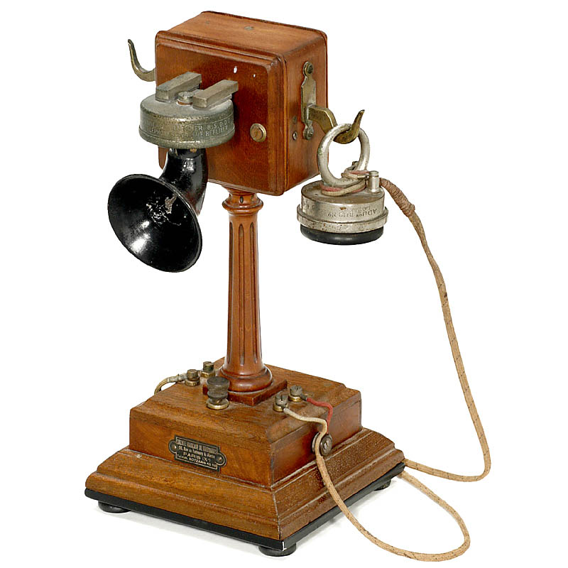 制造商: "Société Française des Téléphones, Paris (S.F.T.)", 送话器上有标记: "Transmetteur Universel Berliner", 听筒制造商为"S.I.T.", 胡桃盒, 高度为33 cm. 一款非常罕见的法国烛台形电话机!