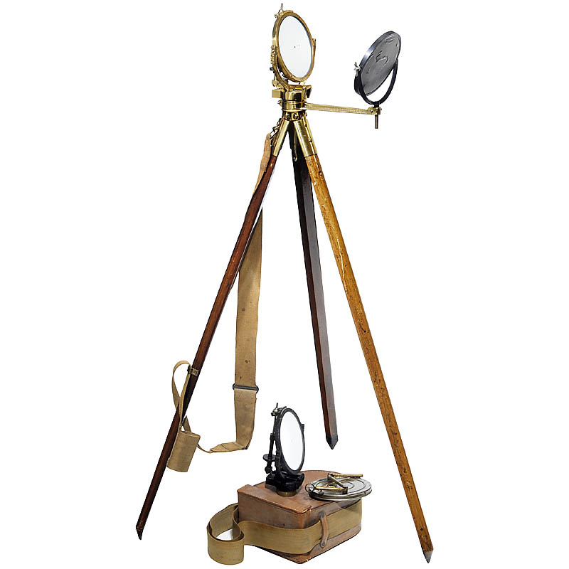有标记: "Helio 5, Mark 5, no. 844512", 黄铜, 原装皮包中放有附件, 带附加的镜子和三脚架. 英国军队在一战时使用过这台设备. 罕见!