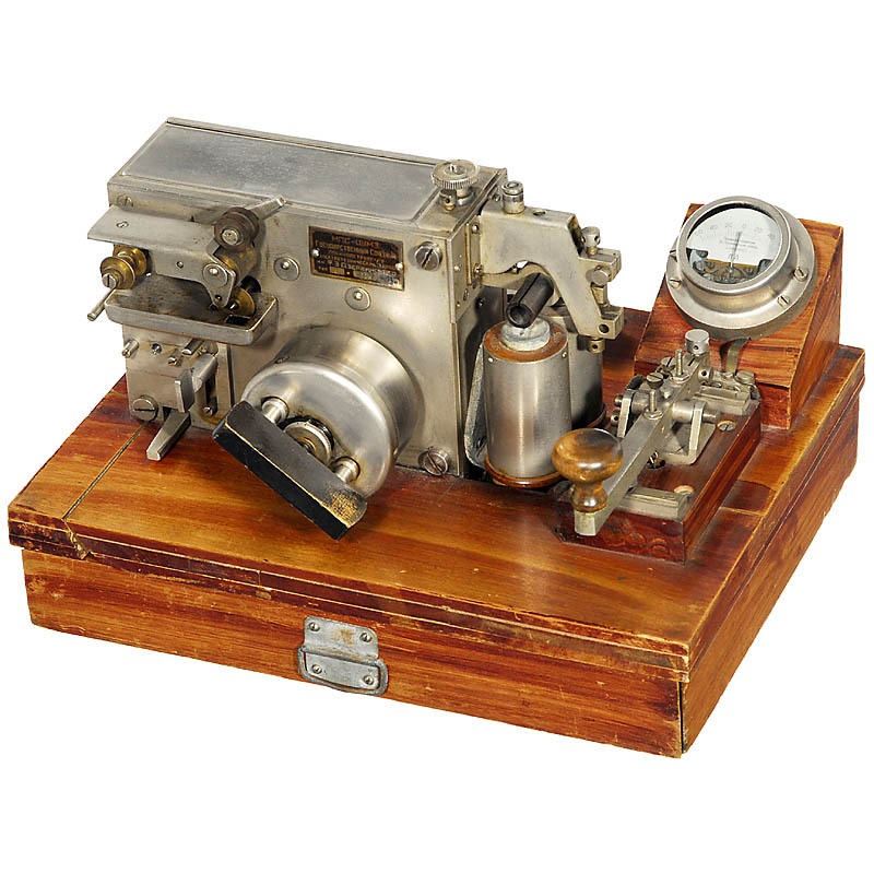 镀镍, 墨水印码机, 发条传动装置(能工作), 带莫尔斯电报键和电流计, 放于木质底座上, 底座上有一个放纸卷的抽屉.
