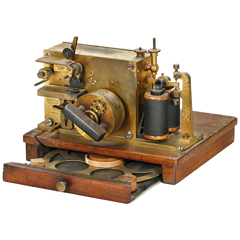 制造商: "L. E. Schwerd, Carlsruhe", 序列号no. 593, 原装涂上硝棉清漆的黄铜, 墨水印码器, 发条传动装置(能工作!), 放于带抽屉的橡木底座上, 非常罕见.