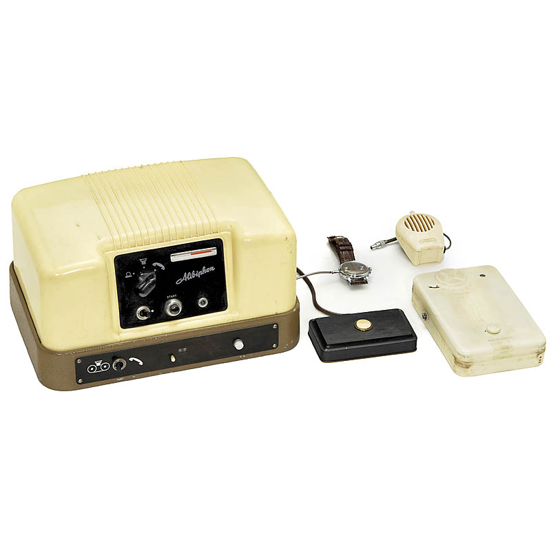 1) 口述录音机"Minifon P51", 钢丝录声和播放机, 制造商为"Protona, Hamburg", 带手表麦克风和皮包.