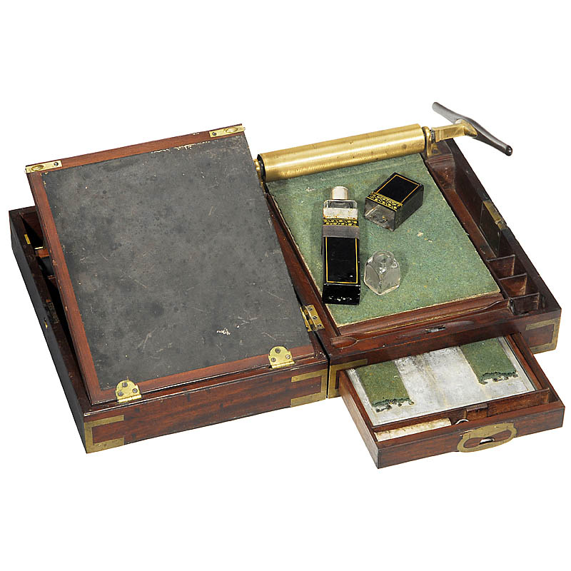 On February 14th, 1780, in England, some 230 years (!) ago, James Watt, the famous inventor of the steam engine, was granted a patent for his first duplicating machine under patent no. 1244. The machine was sold by "James Watt & Company, Soho/Birmingham, England". His invention was a result of his own business as he had permanent correspondence with his partner Matthew Boulton while traveling – mostly to his steam engine projects in Cornwall. James Watt was too often very frustrated when he received a letter after several weeks with answers by M. Boulton to his written questions because he had no copies of his own letters, of course! – So he started developing the world's first portable copying press! And by the end of 1780 150 machines had already been sold, and 630 presses by the end of the first full business year! – It is reported that in the early 1780s Benjamin Franklin, George Washington and Thomas Jefferson used the James Watt copying machine! In 1785 Jefferson was using both the stationary and the portable presses by James Watt & Co. – The portable case opened up on hinges, and its upper section contained a collapsible writing pad for preparing the documents. The typewriter had not yet been invented, and copies could be made only of handwritten letters, diagrams and drawings which were made with a special copying ink! Underneath the writing pad were compartments for pencils, pens, rulers and paper, as well as a special compartment: The "damping box" which was used for treating the copying paper. After 12 hours, the sheets were thoroughly moist, and thus treated and ready to be used for copying. The number of sheets required for immediate use could be removed, and the remainder could be left in the box for up to two weeks, ready to be used at any time. – The actual copying apparatus, consisting of two brass platens which were turned via the side handle, which was also located in the bottom section of the case. The original document was placed in the copying plate in between the feltcovered, swing-up cover plate; the moist – very thin – copying paper was placed on top of it, and was then covered by oilpaper. The pressure induced by slowly turning the plate between the two platens caused the special copying ink of the original to be taken over, and thus transferred, onto the moist sheet (mirror inverted). The copy was ready for use after 24 hours in a drying book of absorbent paper. Because the ink was passed through in this manner, the printing on the copy could, of course, be read only on what was actually the reverse side of the page. The base for good copies was the special copying ink in which the original was written. A great deal of practice was also necessary to prepare sheets for use as copying paper, as they had to be uniformly moistened. The "damping box" shows the original seal of James Watt. Including moistening brush, ink pot, keys, copying paper, fragmented manual and dry ink powder. – Extraordinarily hard to find in this complete condition!