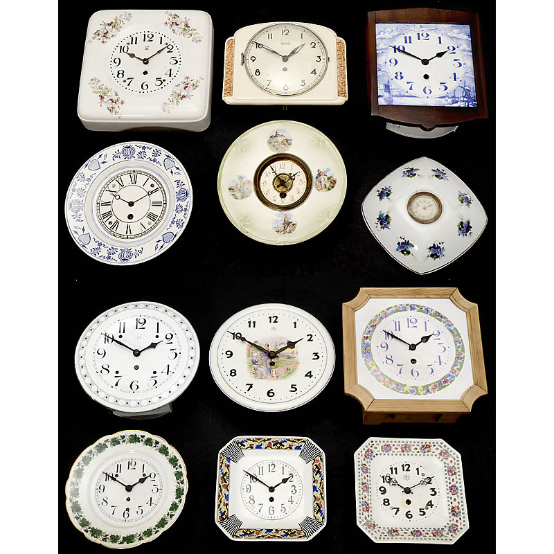 Porcelain with metal and wooden parts, clockwork mechanism, 9 in working condition.