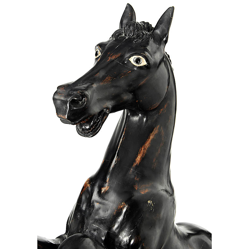 The emblem and trademark of the Italian car manufacturer Enzo Ferrari, carved and painted solid wood, hoofs covered with chrome-plated iron sheeds, glass eyes, electric light in the front hoofs, overall height 70 in.!