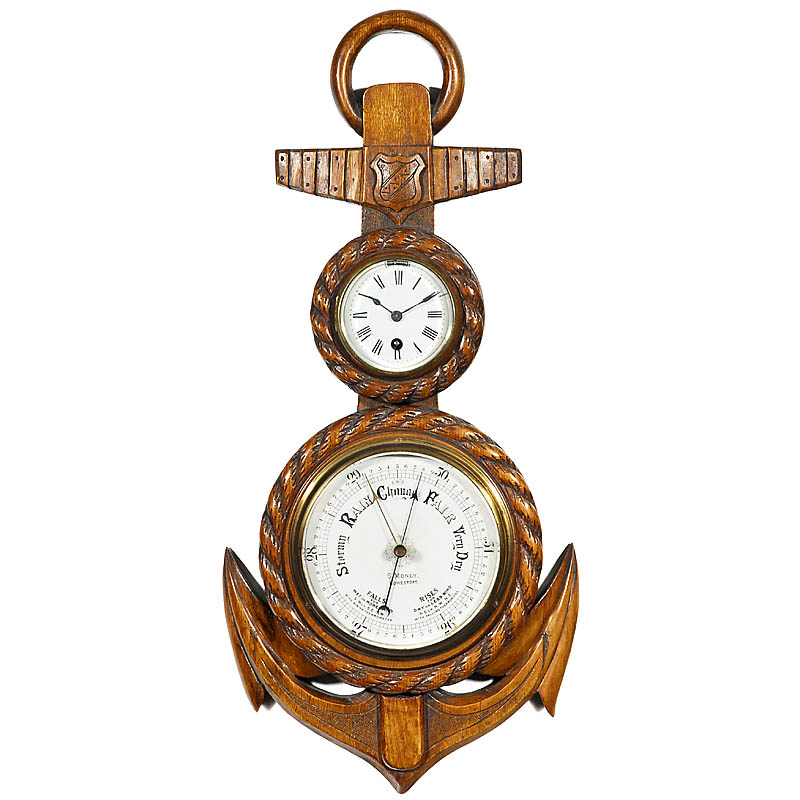 English marine barometer by "S. Money, Lowestoft", in carved oak case shaped like an anchor, height 25 3/5 in., in working order.
