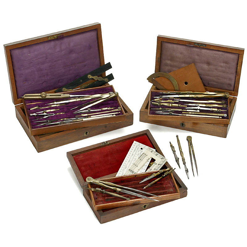 Manufactured by: "J. Backshall" and others, made of brass and steel, partly with bone handles, cases made of mahogany, lined with velvet, partly not complete.