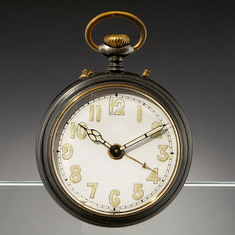 4) Pocket watch with iron case, with alarm, fluorescent hands and numerals.