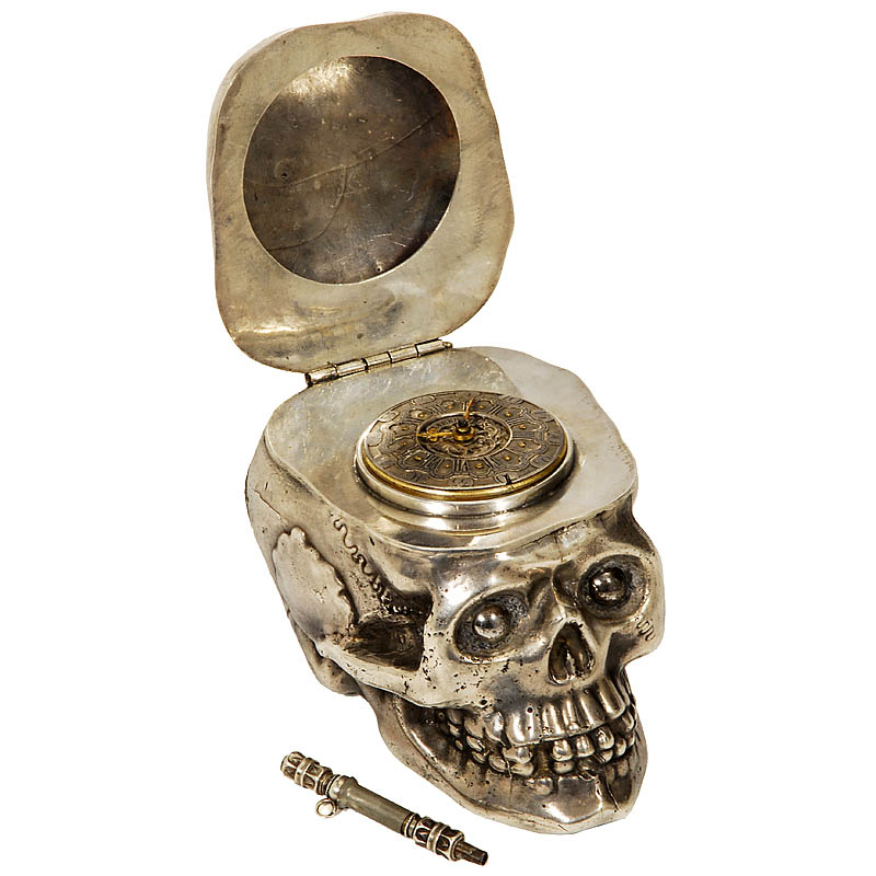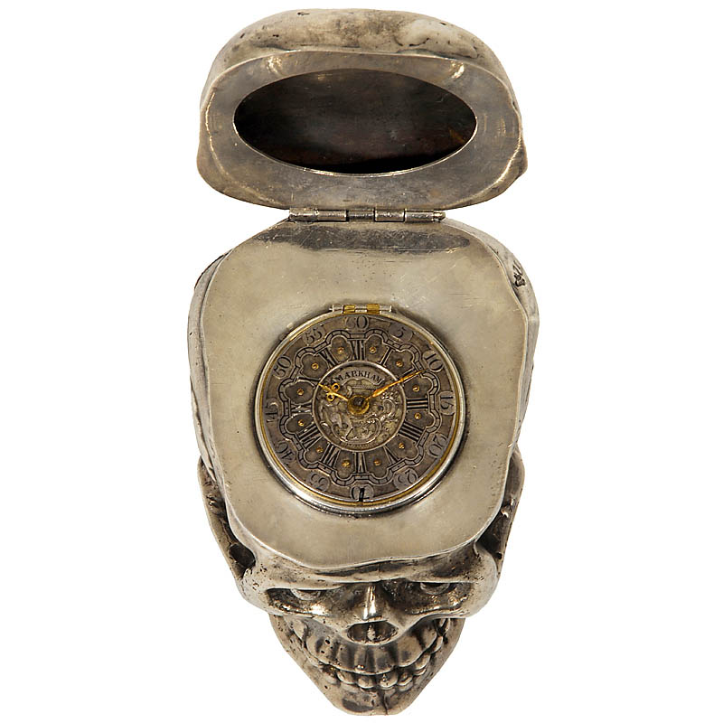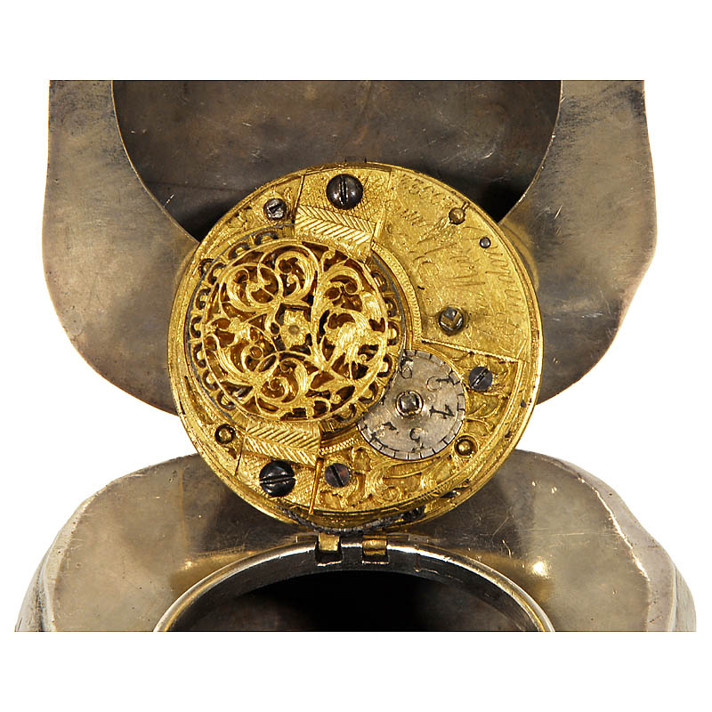 Large and heavy silver case, 2 ¾ in. height, with multiple hallmarks, verge and chain movement, signed "Markham, London, 19922", nicely engraved plate, keywind, working. With key.