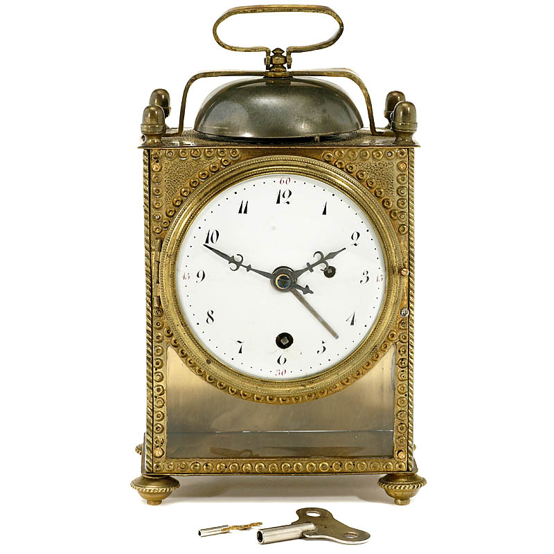 8-day movement, anchor escapement, large bell, enamel dial, brass case with pressed decoration and 3 glazed sides, movement needs cleaning, height 8 ¾ in.
