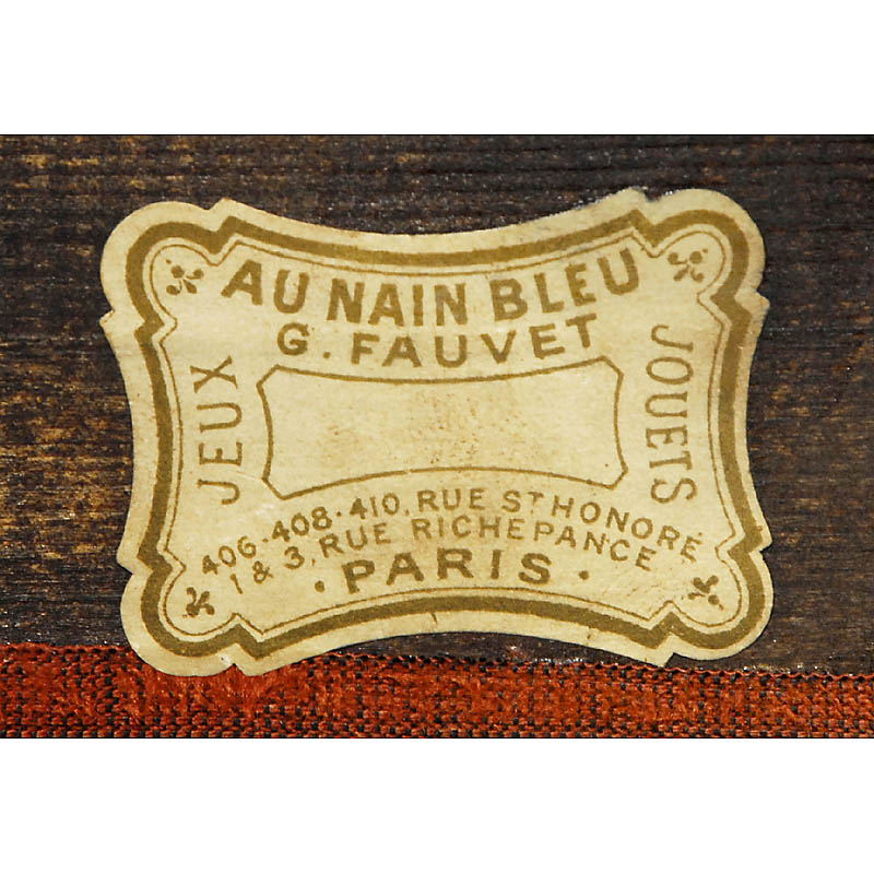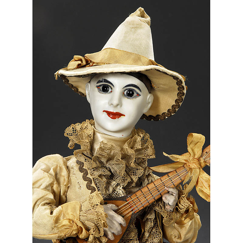 With white bisque character head impressed "S.F.B.J. 255, Paris", closed mouth, fixed black glass eyes with dramatic make-up, composition hands, mandoline decorated with painted roses, velvet-covered base containing open-spring movement that plays 2 airs ("Valencia" and "On the Riviera" on 1 revolution) and causes Pierrot to strum while swaying left and right, dressed in original fragile cream silk suit, jacket, had and lace ruff trimmed with metal-thread, ribbons and large pink buttons. Height 22 in. (56 cm) with hat (factory firing split on back wig aperture), with steel "LB" key, tune sheet and original shop label: "Au Nain Bleu, G. Fauvet, Jeux, Jouets, 406, 408, 410 rue St. Honoré, 1 & 3 rue Richepance, Paris". In working order. – A romantic Lambert Automaton with rare character head by the Société Française de Fabrication des Bébés et Jouets and label from the historic Parisian toy shop.