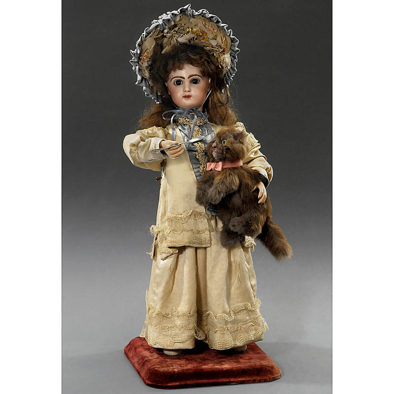 With Jumeau bisque head stamped "Déposé Tête Jumeau, Bte. S.G.D.G. 9" and painter’s marks "16xi", closed mouth, fixed brown paperweight eyes, feathered brows, pierced ears, cork pate, brown hair wig, papiermâché hands holding teaspoon and a fur-covered cat with green glass eyes, articulated mouth and tail, goingbarrel motor with bellows and small single-air movement in the body that causes the girl to turn and nod her head in a circular motion and offer the teaspoon three times while the cat opens its mouth, curls its tail and ‘mews’. Dressed in fragile cream and blue satin costume with gossamer edging, height 24 ½ in. (62 cm) with key (one size too large), (light rubs on cheeks, chin and brows, hands repainted).