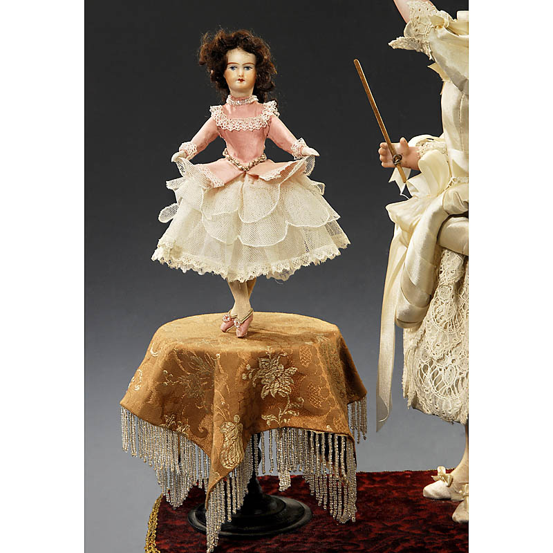 With S.F.B.J. era bisque socket head stamped "Tête Jumeau", open mouth, fixed blue paperweight eyes, pierced ears, synthetic wig, bisque shoulderplate and hands holding lorgnette and baton, the student with bisque head, painted eyes and articulated legs dancing atop turned pedestal table, on velvet-covered base containing going-barrel movement that causes the dancing mistress to direct with the baton and turn and incline her head to look through the lorgnette while her pupil pirouettes on the table, elegantly dressed in heeled pumps, ivory silk costume trimmed with ribbons, lace and matching bicorn hat, height 21 in. (53.5 cm) (larger figure has chip on one elbow under sleeve and a repainted area around right ear, cheek and temple, which is mostly covered by the wig). – Provenance: Decamps family collection. A later production piece by Decamps made with early 20th century elements. In good working