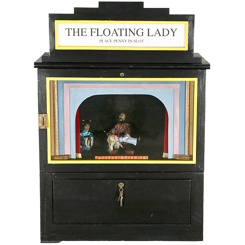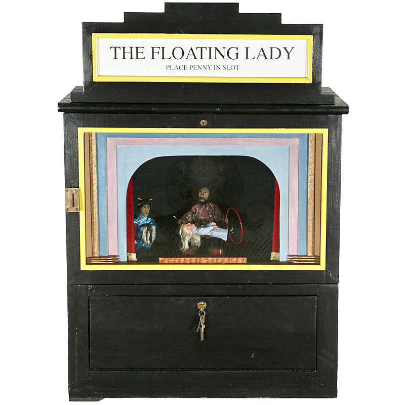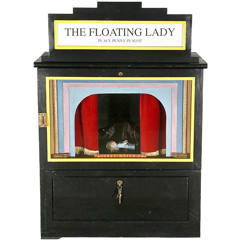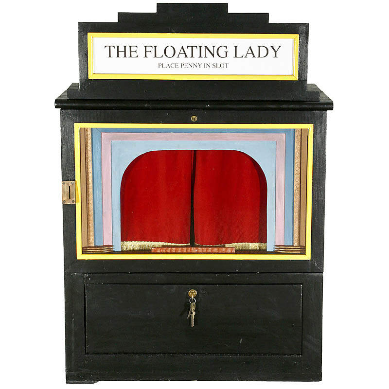 English arcade machine with 5-old-penny slot, electric motor (230 V) and wooden case 28 x 18 ½ x 39 1/3 in. Put a coin in and the scene will unfold: the curtains open, light shines inside, the lady floats and the magician circles the lady with a hoop. Good working condition.
