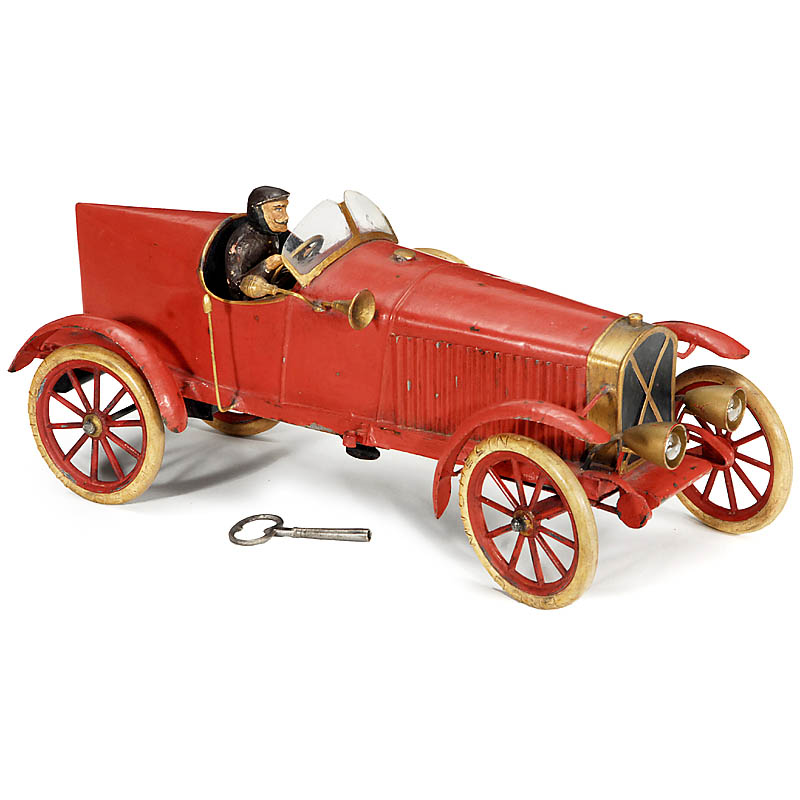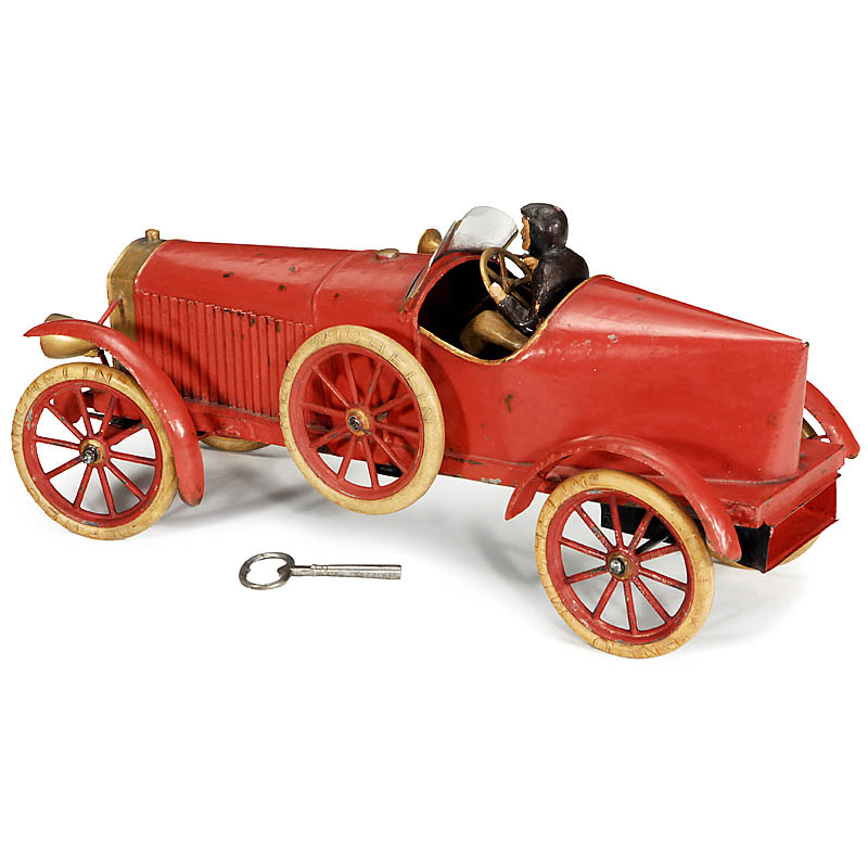 Manufactured by: "Eugène Pinard, Paris", clockwork motor (working), hand-painted tinplate, rubber tyres, electric front and rear light, driver figure added, length 15 ¾ in. Hard to find in this large size.