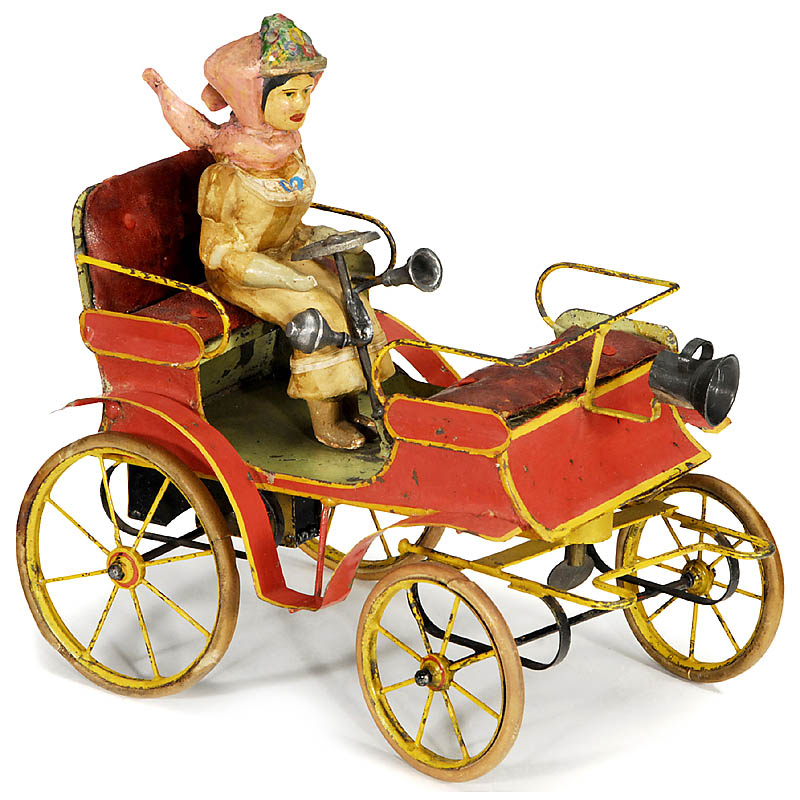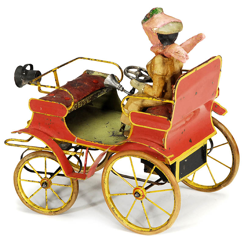 Hand-painted tin toy car, with clockwork motor (working), steerable front axle, cast-metal headlamp, horn and steering wheel, upholstered leather seats, rubber tyres, driver figure added, 9 ½ in. length. Original condition.