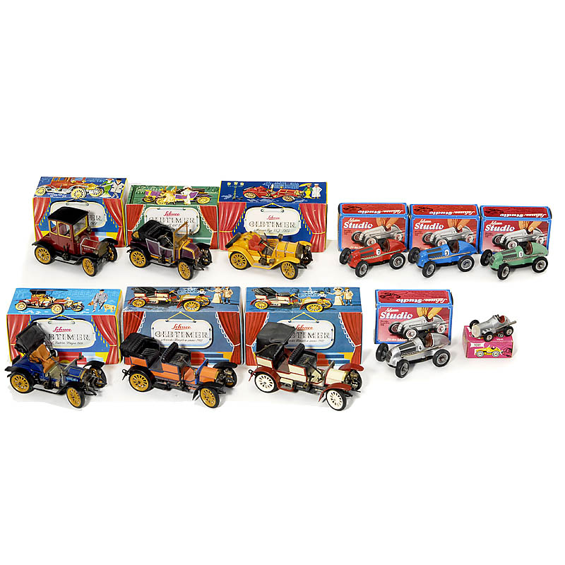 1–6) Schuco Oldtimer no. 1230, 1225, 2 x 1229, 1228 and 1227.