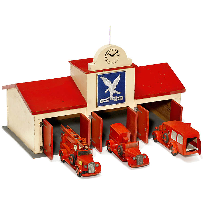 Manufactured by Tekno, Denmark, wooden building with 3 garages, size 19 x 10 x 11 ½ in., 3 fire brigades (1 without front wheels), painted tin, with 2 figures.