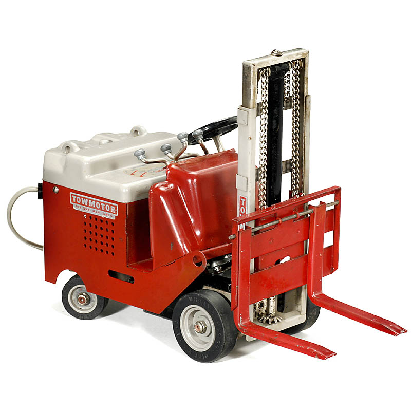 Manufactured by "Urbana Mfg. Co., USA", "Towmotor" model, metal body, electric motor drive (110 V), with the following functions: forwards and backwards drive, loading up and down, tilting of the fork, steerable rear axle, complete and working, length 14 1/5 in.
