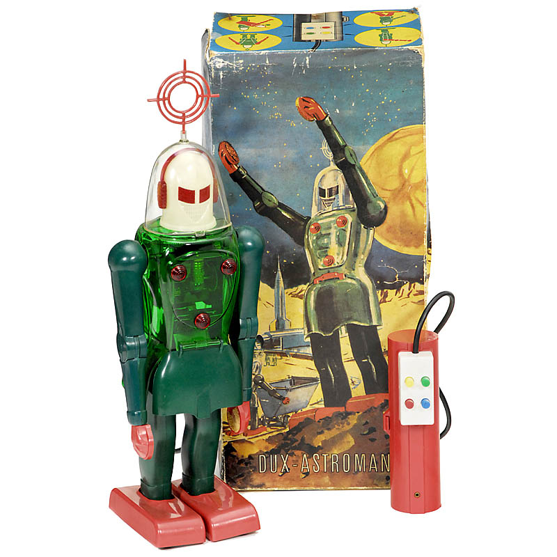 German toy robot, mixed materials, working but movements restricted, height 11 in., very good condition, original box with damages.