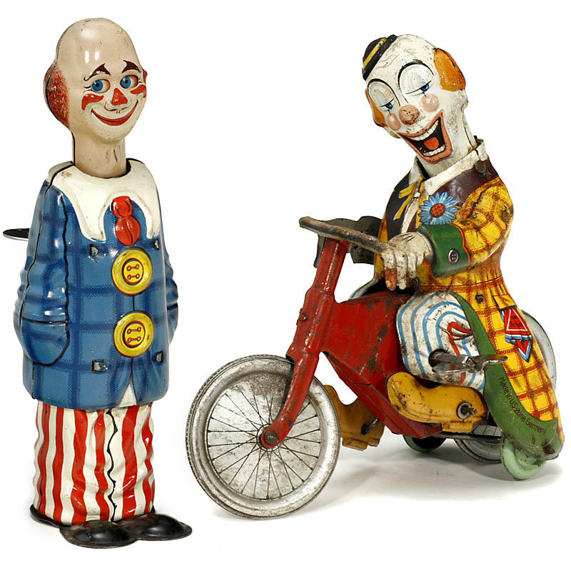 2) "Merry Clown on Motorcycle" by Technofix, height 5 ½ in., US-Zone Germany. (3-/2)