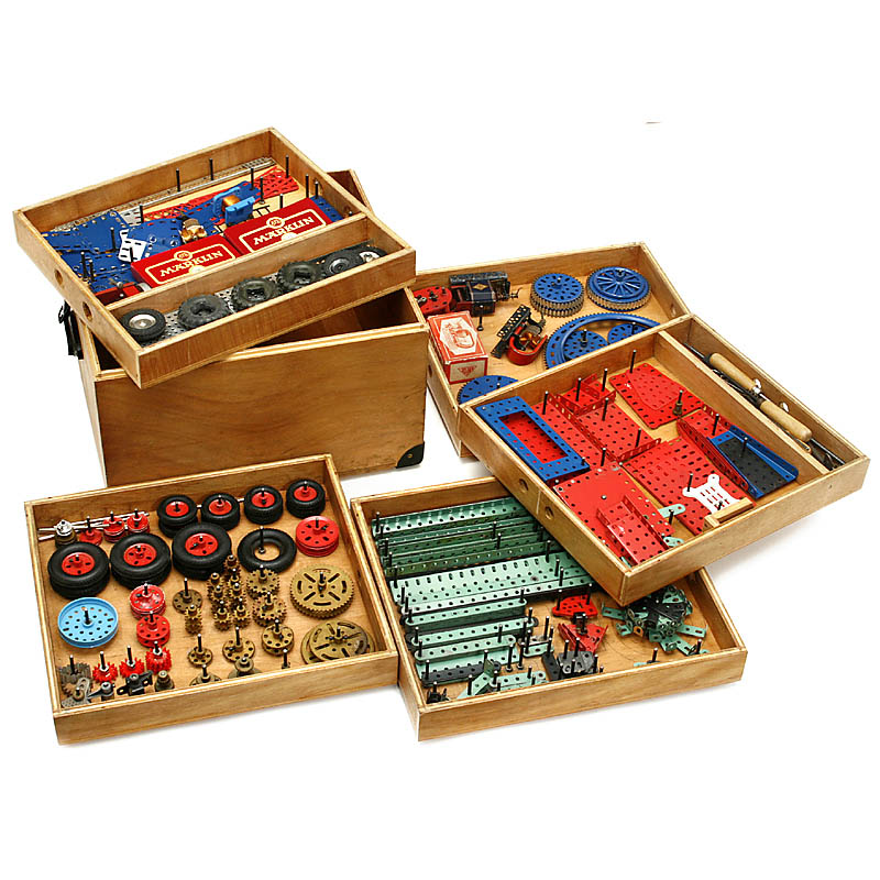 1) Wooden box with Märklin construction kit parts, including some Trix parts, with 4 motors.