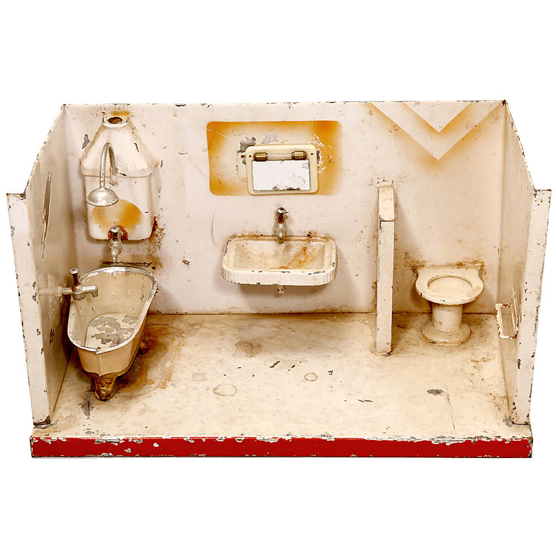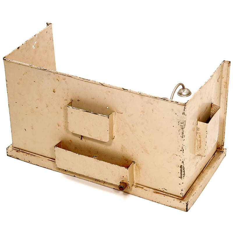 Unmarked, hand-painted tin, with 3 water containers and 3 taps, size 11 ¾ x 6 ¼ x 6 ¾ in.