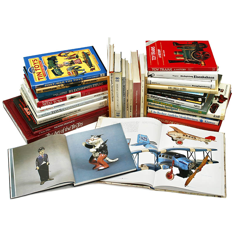 30 books about toys, in German, English, French and Dutch, including "The Art of the Tin Toy", "Märklin, die großen Jahre", "Les Jouets Extraordinaires" and "Antieke Modelbaan".