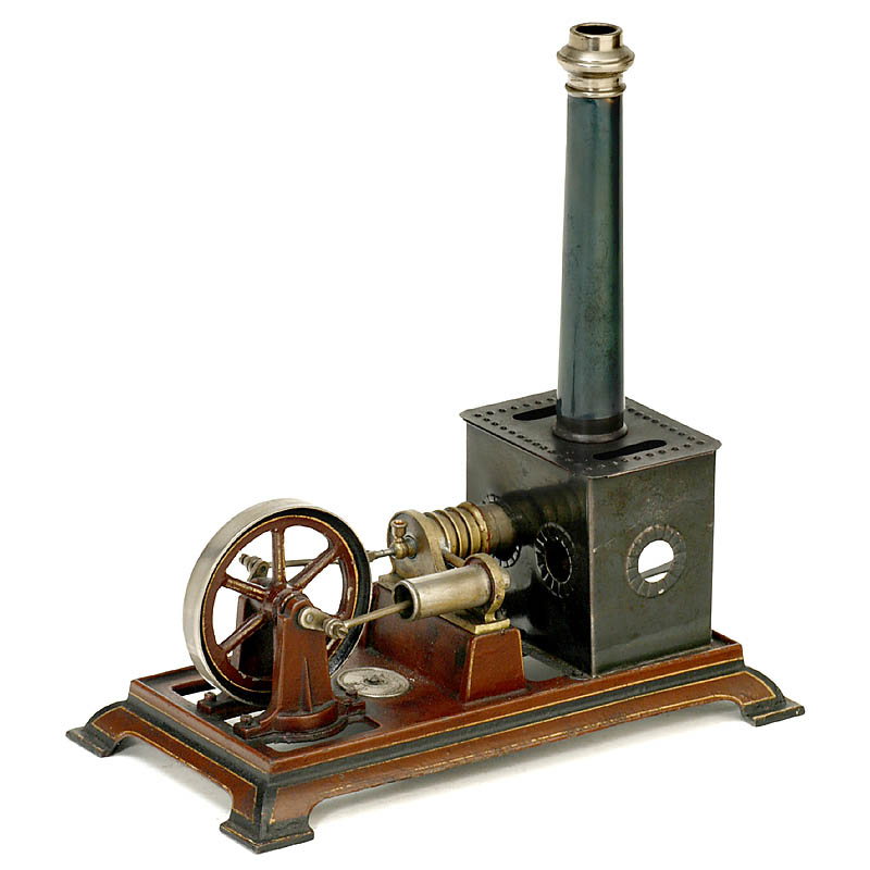 "Ernst Plank", Nuremberg, working and displacing cylinders arranged side by side, flywheel Ø 3 in., castmetal base, overall size: 9 ½ x 5 x 9 7/8 in., complete with burner.