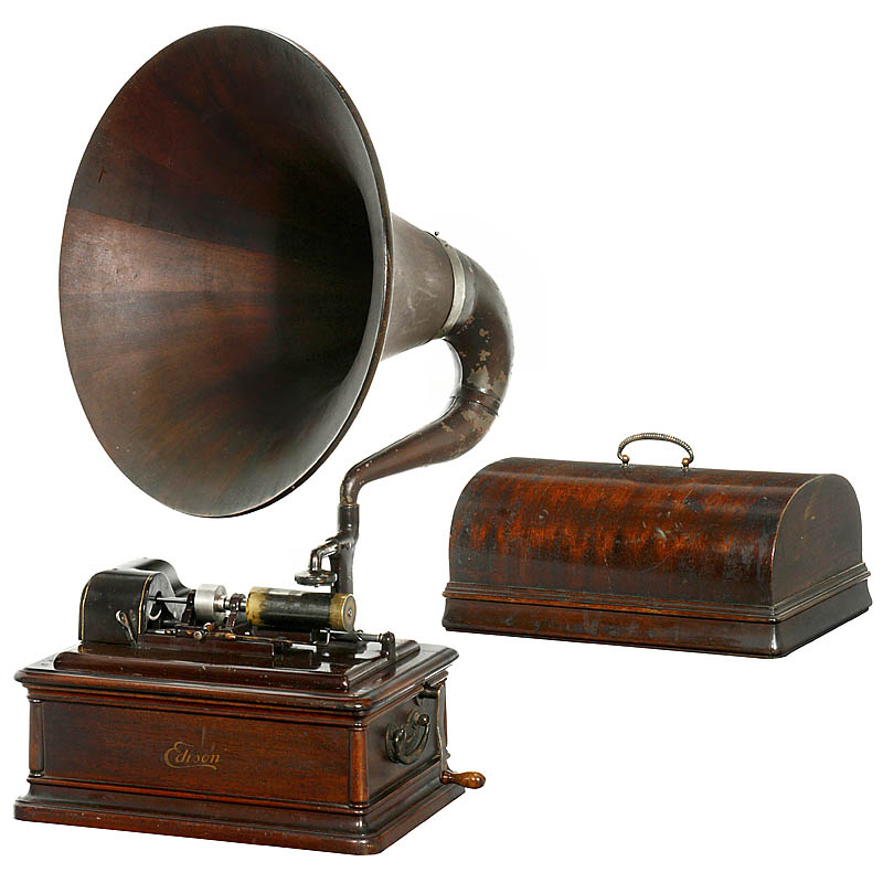 Type SM, model A. For 4-minute cylinders. Serial no. 626! With "Model L" reproducer, mahogany cabinet with Edison label and lid, top-plate and all fittings finished in brown with gilt lining, beautiful mahogany Edison Cygnet horn. – Very good condition – plays excellently! – This phonograph is an absolute highlight in the evolution of cylinder players! – Add-on: 2 extra pickups (not complete) and 3 books about phonographs.