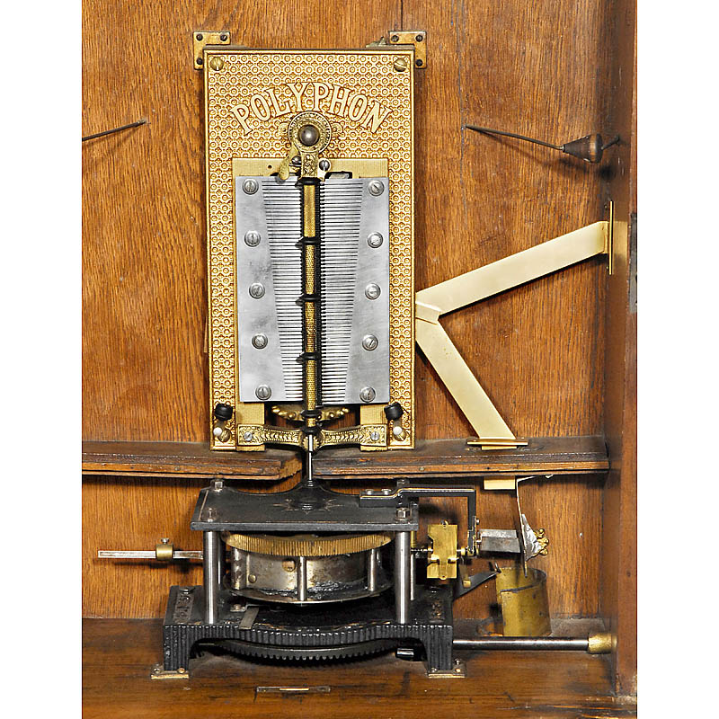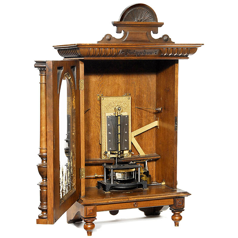 No. 18207, for 19 5/8 in. discs, with double combs of 120 teeth (complete), cast bedplate and coin-activated movement, in carved walnut case with glazed door and later small pediment, height 38 in. (96.5 cm), with crank and 15 discs. The classic Polyphon in good playing condition!