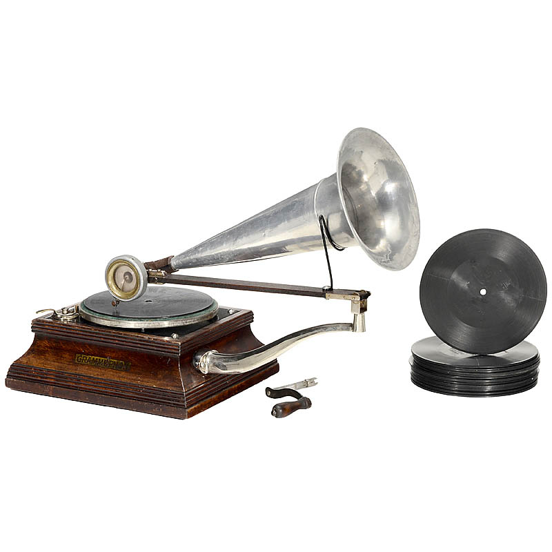 Small German gramophone with aluminum horn, wound through the turntable, working but runs too fast. With 18 original Ø 7 in. "Berliner" discs, marked on the reverse "Reproduced in Hanover", all discs with glued cracks, but still playable. – The first ever 78 r.p.m. discs produced in Germany, manufactured by the inventor Emil Berliner.